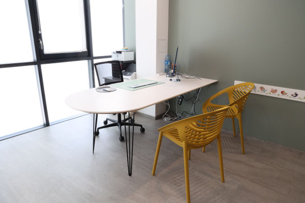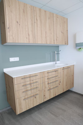 Nos équipes ont également conçu les paillasses, plans de travail et bureaux sur mesure des trois salles de soins, alliant fonctionnalité et design épuré.