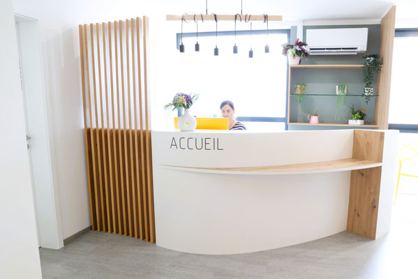 L’espace d’accueil se distingue par un comptoir courbe intégrant un claustra décoratif et une