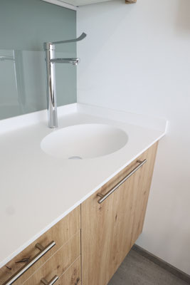 Pour apporter une touche de chaleur, la tablette et la retombée ont été réalisées en stratifié bois, en contraste subtil avec la